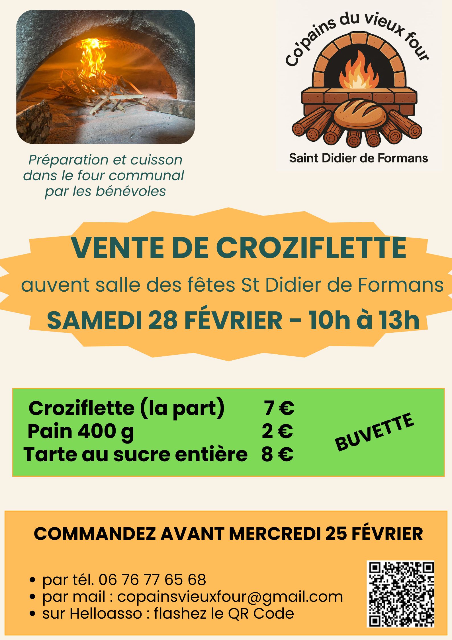 Réservez dès maintenant et jusqu'au 25 février (dernier délai), votre portion de croziflette, votre pain, et votre tarte au sucre préparés et cuits dans le four à pain communal.