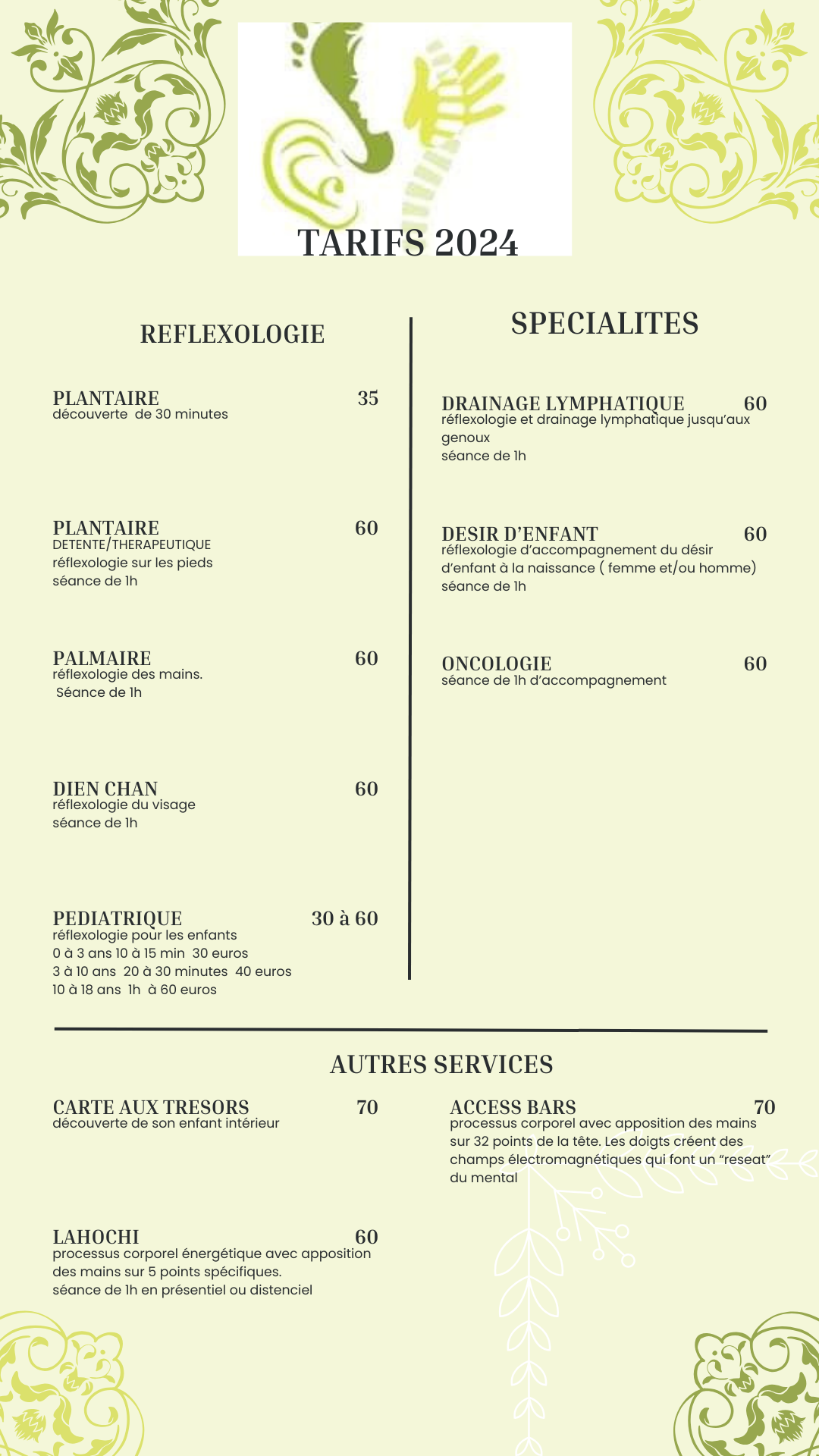 Je vous accueille dans un espace lumineux, calme et serein afin de vous faire découvrir la RÉFLEXOLOGIE PLANTAIRE, PALMAIRE et Dien Chan (faciale) et ses vertus apaisantes et thérapeutiques.
